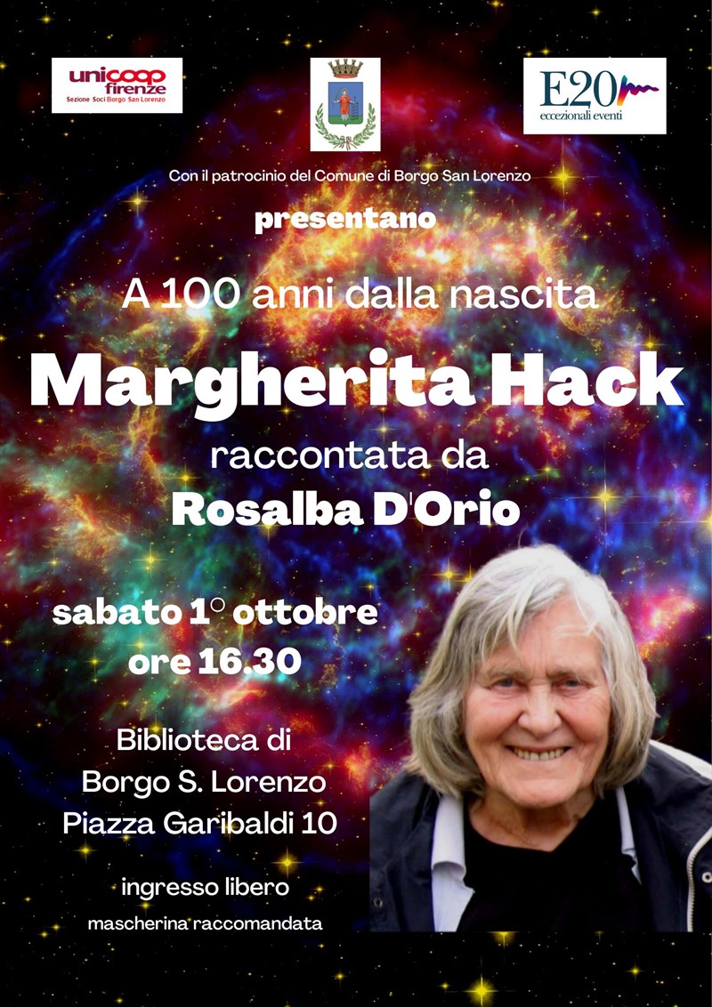 A cura dell’Associazione Culturale “Eventi20’”, con la collaborazione della sezione Soci Coop di Borgo San Lorenzo sotto il patrocinio dell’amministrazione comunale, a 100 anni dalla nascita di Margherita Hack, organizza per sabato prossimo 1 ottobre 2022, un incontro con Rosalba D’Orio, che racconta la vita e la storia di questa scienziata , che Borgo San Lorenzo gli ha dedicato una piazzetta. L’incontro avverrà presso la Biblioteca Comunale in piazza Garibaldi calle ore 16,30 con ingresso libero. Tutta la cittadinanza è gentilmente invitata. (A.G)