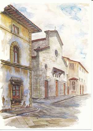 Foto 1 (in alto): Un bellissimo acquerello dell’artista fiorentino Elio Bargagni raffigurante la facciata della Pieve romanica di San Lorenzo