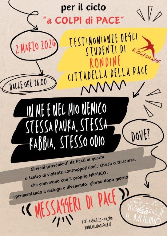 Un nuovo incontro per il ciclo "A colpi di Pace" con testimonianze degli studenti di Rondine – Cittadella della pace – SABATO 2 MARZO ore 16 presso il Mulino – Vicchio