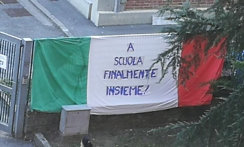 ‘A scuola – Finalmente insieme’. La scritta sulla bandiera italiana accoglie i bambini a Borgo