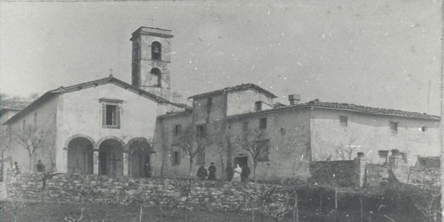Foto 1 : L’antica Pieve romanica di San Pietro a Vaglia in una immagine dell’avv. Giuseppe Ungania del 1909. (Archivio A.Giovannini) Foto 2 : Interno della Pieve di San Pietro a Vaglia; una grande figura di sacerdote, il Pievano don Mario Martinuzzi. (Foto A.Giovannini)