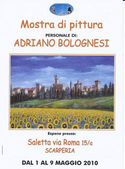 Sabato 1 maggio 2010, sarà inaugurata a Scarperia, alle ore 17,30 nella saletta espositiva in via Roma al numero civico 15/a, una mostra personale del pittore Adriano Bolognesi (studio e abitazione a Le Balze di Vicchio), uno dei più conosciuti e stimati artisti mugellani facente parte dell’Associazione “dalle terre di Giotto e dell’Angelico”.