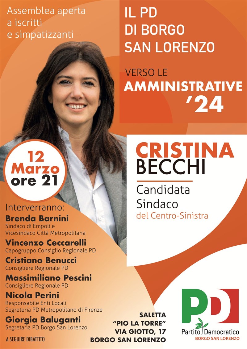 Martedì 12 marzo, ore 21, presso la Saletta Pio La Torre a Borgo San Lorenzo, si terrà un’assemblea del Partito Democratico locale aperta a iscritti e simpatizzanti insieme a Cristina Becchi, candidata Sindaco del Centrosinistra. Questa sarà l'occasione per condividere insieme le idee del partito e di Cristina per la Borgo San Lorenzo dei prossimi 5 anni, un'idea di futuro che vogliamo costruire insieme attraverso spunti, riflessioni e idee dei cittadini. All’incontro interverranno Brenda Barnini (Sindaco di Empoli, Vicesindaco della Città metropolitana di Firenze), Vincenzo Ceccarelli (Capogruppo del Consiglio regionale del PD), Cristiano Benucci e Massimiliano Pescini (Consiglieri regionali del PD), Nicola Perini (Responsabile Enti Locali Segreteria PD Metropolitano Firenze) e la Segretaria Giorgia Baluganti. Agli interventi seguirà il dibattito."