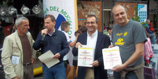 Un momento istituzionale della Maratona del Mugello; da sinistra Luca Tagliaferri, già Campione d’Italia di Maratona, il sindaco di Scarperia Federico Ignesti, il sindaco di Borgo San Lorenzo Giovanni Bettarini e il dirigente del G.S.Atletica Marciatori Mugello Gabriele Sargenti.