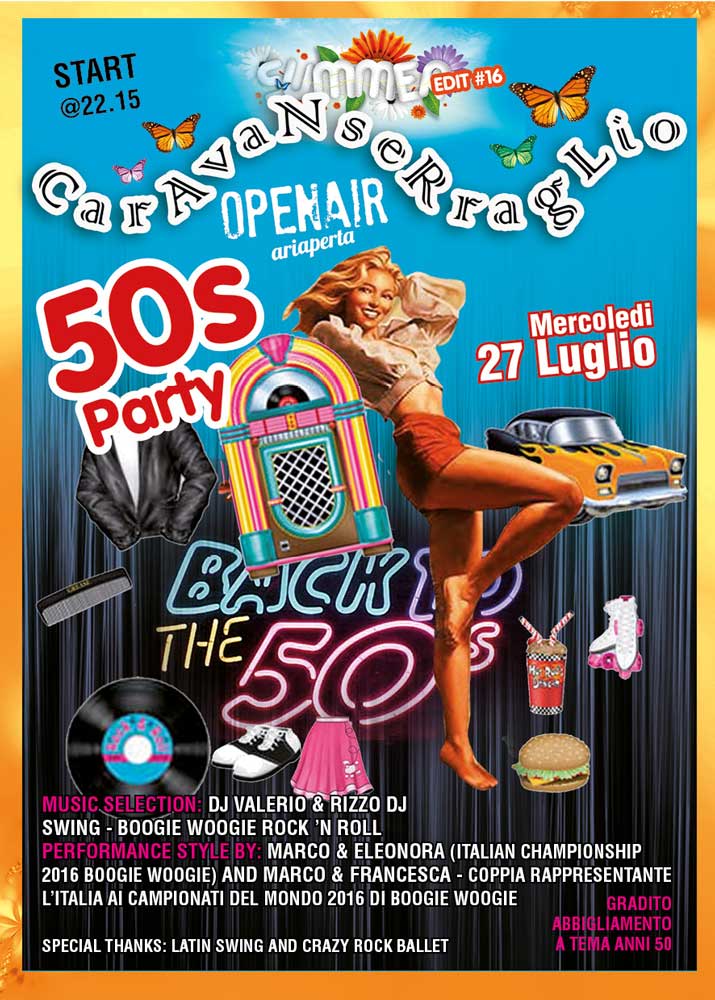 Mercoledì 27 Luglio “Back To 50 the party” al Caravanserraglio di Monte Morello. Un appuntamento al ritmo di Rock ‘N Roll, Swing e Boogie Woogie in collaborazione con OK!Mugello per rivivere le emozioni degli anni 50. Durante la serata SWINGVESTIGATION!! Show di Boogie Woogie di Marco Baracchi e Francesca Checcacci (che disputeranno con i colori azzurri il prossimo campionato mondiale di ballo). Un palco, un pista, ed il panorama mozzafiato di Monte Morello saranno lo scenario di una serata all’insegna del divertimento e della musica selezionata dal Dj Valerio Burberi, presente nelle principali serata a tema della Regione. L’evento è organizzato dal Ristorante Caravanserraglio di Monte Morello in collaborazione con OK!Mugello, la scuola di ballo Crazy Rock Ballet di Pontassieve.