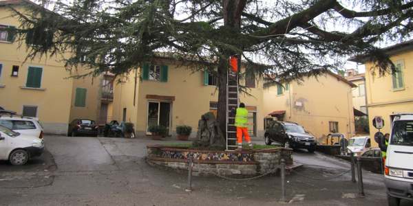 E quest’anno (dopo 30 anni) tornano gli addobbi natalizi sul grande albero sorto dove c’era la latrina. Una delle caratteristiche di addobbi tradizionali durante le Feste Natalizie a Borgo San Lorenzo era l’illuminazione del maestoso albero in piazza del Poggio, uno dei rari esempio di vecchia alberatura in un centro storico cittadino. Borgo aveva anche questa “eccellenza”. In questa micro-storia, vogliamo ricordare dove è posizionato l’albero con ai piedi il fatiscente Monumento alle Vittime Civili con la seduta “chiniana”, c’era una volta un “Vespasiano “ (vedi l’immagine sul libro “Caro Vecchio Borgo”), una latrina costruita ad esagono, dove all’interno fatiscenti e puzzolenti gabinetti alla “turca” facevano bella mostra (per modo di dire) di sé, ma nell’estate l’odore nausebondo delle urine e degli escrementi erano davvero insopportabili, fra mosche e vermi, così come mi è sempre stato detti da tanti “vecchi” borghigiani. Poi un giorno il Podestà (sindaco) il Cav. Giovanni Bandini, disse basta a questo sconcio, a questo obbrobrio, e così nel 1931 fu buttato tutto giù, facendo posto ad un albero che avrebbe ingentilito la piccola piazza del Poggio. Beppino Borselli, (quanto era felice quando ce lo raccontava), prese il suo camioncino, con altri due borghigiani, andarono a prenderlo a Grezzano nella tenuta dei Sigg.ri Dapples, per poi piantarlo dai giardinieri comunali nella piazza del Poggio. Crebbe abbastanza alla svelta ( la ninfa sotto terra era ben concimata dalla latrina!!) e dopo la guerra, l’amministrazione comunale durante le Festività natalizie, decise di addobbarlo per augurare Buone Feste a tutti i borghigiani. Tutto bene fino a quando non ci si mise di mezzo la politica e le ideologie contrapposte. Gli americani erano in guerra nel sud est asiatico ed ecco sull’albero ( anni ’60 del ‘900), apparire invece di Buone Feste la scritta “Pace nel Vietman”, poi furono i sovietici ad entrare in guerra in Afghanistan, ma però la scritta “Pace in Afghanistan” ( anni ’70 del ‘900) non apparve mai e giù polemiche a non finire. Poi subentrarono altre cose, altre squisquiglie, altre polemiche e l’albero del Poggio per le Feste Natalizie rimase al buio. Sono passati quasi 30 anni dall’ultima accensione e sabato scorso (scriviamo la data: sabato 29 novembre 2014, perché ne resti testimonianza), abbiamo visto gli operai comunali con le scale ad inserire nei rami luci ed addobbi. La guerra nel Vietnam non c’è più, così nell’Afghanistan, quindi a questo punto si spera che la tradizione vada avanti, almeno per le nuove generazioni, insomma che l’albero non sia di parte, ma di tutti, nella pace e nella concordia. Buon Natale e Buone Feste. (Aldo Giovannini) Foto 1 (in alto): Anni ’10 del ‘900 ( 1914 ca). Si costruiscono le latrine pubbliche in piazza del Poggio. Foto 2 (qui sopra): Operai comunali mentre stanno addobbando l’albero del Poggio. (Foto e arcvihvio A. Giovannini)
