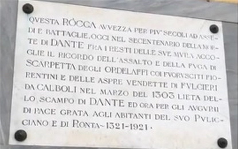 Una piccola ‘perla’ mugellana. Nell’ambito del progetto ‘Le Vie di Dante, tra Toscana e Romagna, e verso l’anniversario dei 700 anni dalla morte del Sommo Poeta, una serie di videoservizi giornalistici ricordano le tracce legate a Dante. Uno di questi è stato realizzato davanti alla chiesa di San Maria a Pulicciano (Ronta, Borgo San Lorenzo) che accoglie sulla sua facciata una targa realizzata nel 1921 (in occasione dei 600 anni dalla morte di Dante 1321-1921) e in ricordo dell’assalto e della fuga di Scarpetta degli Ordelaffi e dei fuoriusciti fiorentini, che avvenne nel marzo del 1303.