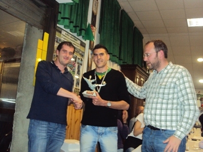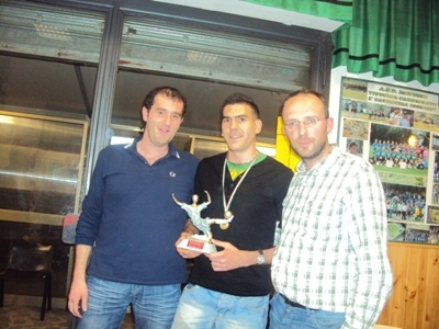 In alto e sotto Michele Batistoni premiato da Alessandro Materassi (a sinistra) e Alessio Barletti; in basso l’allenatore della Rontese Iacopo Benvenuti con Michele Batistoni (Foto Mara Messina).