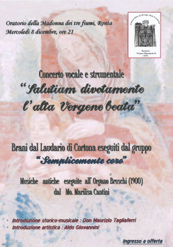 Il comitato per il restauro dell’organo Stefanini 1696 di Borgo San Lorenzo, porta a conoscenza che mercoledì 8 dicembre 2010 (ore 21,15), festività della Madonna, presso l’Oratorio della “Madonna dei Tre Fiumi” (Ronta di Mugello), un concerto vocale e strumentale denominato “Salutiam divotamente l’alta Vergine beata”, tratta dai brani dal laudario di Cortona dal Gruppo Vocale “Semplicemnente coro”.