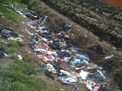 E’ possibile notare, dalle foto scattate sempre domenica mattina, come ci siano persone che vanno a frugare nel cassonetto giallo (quello per i vestiti della Caritas, per intenderci) per cercare, chissà, forse l’ultimo grido alla moda. Per poi riversare nella addiacente scarpata il contenuto del cassonetto, permettendo così di dare un segno tangibile del loro passaggio.