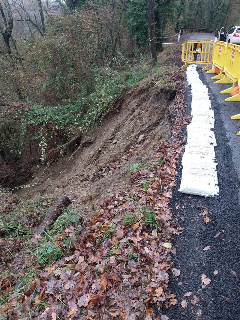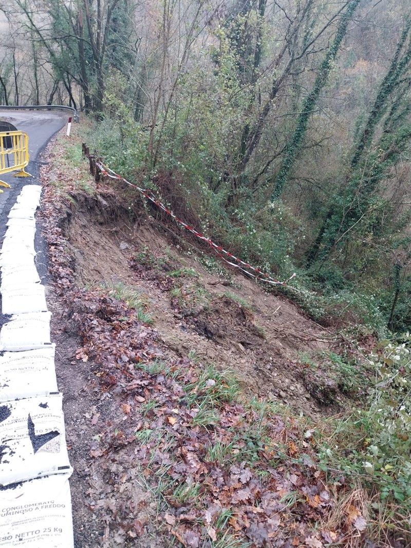 Dai sopralluoghi emerge una situazione dove sussistono varie criticità che aggravano la fragilità della viabilità dovute a inadeguata manutenzione della banchina stradale con interramento della cunetta stradale e occlusione della caditoia per il raccoglimento delle acque che, con la pioggia del 1° dicembre, hanno invaso la strada dove appare già ribassata verso valle, dando origine a movimento franoso.
