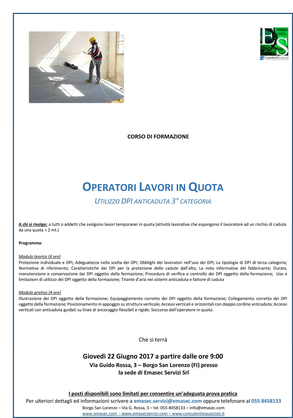 Per ulteriori informazioni e iscrizioni: Emasec Servizi Srl Via Guido Rossa, 3 50032 Borgo San Lorenzo (FI) Email: emasec.servizi@emasec.com