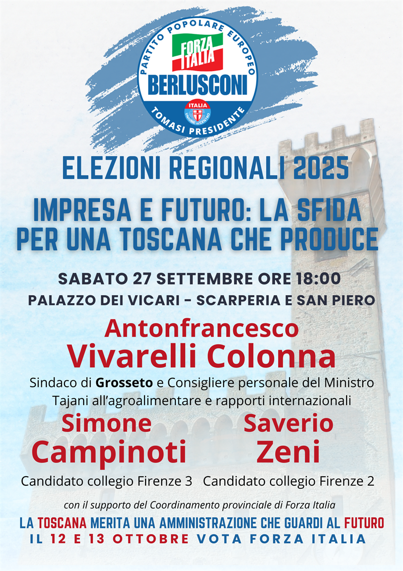 Un appuntamento da non perdere per chi ha a cuore il futuro della nostra regione. Sabato 27 settembre, alle ore 18:00, il suggestivo Palazzo dei Vicari di Scarperia e San Piero si trasformerà nel palcoscenico di un dibattito politico e sociale di grande attualità, organizzato da Forza Italia in vista delle elezioni regionali del 2025. L'incontro, intitolato "Impresa e Futuro: la sfida per una Toscana che produce", si preannuncia come un momento di confronto diretto e costruttivo.