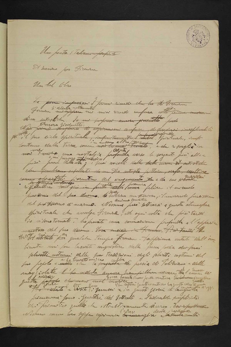 Nel 2017 alla Biblioteca Medicea Laurenziana si mostrarono i manoscritti delle prove che Dino Campana sostenne, senza successo, nel concorso indetto nel 1911 dall’Istituto di Studi Superiori, per l’abilitazione all’insegnamento del francese, esperienza a lungo ignota alle biografie contenuti nell’archivio degli Affari Risoluti, Biblioteca Umanistica, sede di Lettere che raccoglie le pratiche emesse e ricevute dalla Sezione di Filosofia e Filologia dal 1859 al 1930, immenso giacimento che offre molte notizie inedite. I quattro manoscritti: un tema in italiano (A zonzo per Firenze), uno in francese (Le repentir), un dettato e una traduzione dall’italiano al francese. Costituiscono le prove che Dino Campana sostenne in occasione del concorso indetto nel 1911 dall’Istituto di Studi Superiori di Firenze per l’abilitazione all’insegnamento delle lingue straniere nei ginnasi del Regno. Campana vi partecipò per il francese, ma a causa dei risultati negativi ottenuti negli scritti, purtroppo la sua conoscenza del francese aveva gravi carenze grammaticali e, soprattutto nel dettato, prese una grave insufficienza, arrivò decimo su undici candidati e venne bocciato.