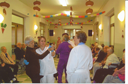 Foto 1 : Nella Sala delle Feste i volontari dell’AVO (Associazione Volontari Ospedalieri), danzano con gli ospiti della Casa di Riposo firenzuolina.