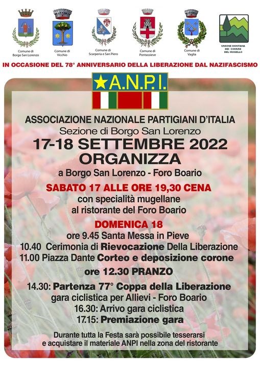 Sabato 17 settembre a cena e domenica 18 settembre per una giornata dedicata al 78esimo anniversario della Liberazione dal nazifascismo vi aspettiamo a Borgo San Lorenzo
