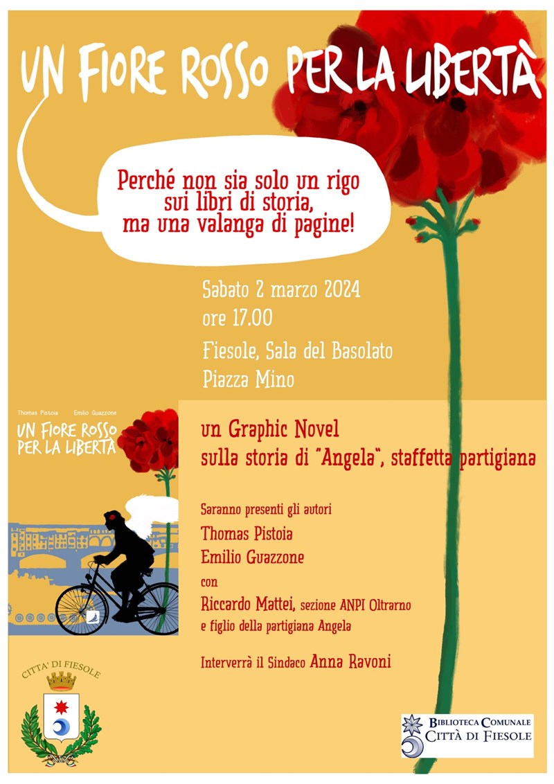 Un graphic novel per raccontare la Resistenza e la Liberazione attraverso la storia di Liliana Benvenuti, “Angela”, staffetta partigiana del Comando di Divisione Arno-Potente, tra i protagonisti della lotta di Liberazione di Firenze e simbolo della Resistenza fiorentina, impegnata a promuovere la Memoria tra i ragazzi delle scuole fiorentine, fino alla sua scomparsa nel 2019. Si tratta di "Un fiore rosso per la libertà" di Thomas Pistoia ed Emilio Guazzone che sarà presentato sabato 2 marzo alle 17.00 in Sala del Basolato alla presenza di Riccardo Mattei, della Sez. Anpi Oltrarno e figlio di Liliana Benvenuti.