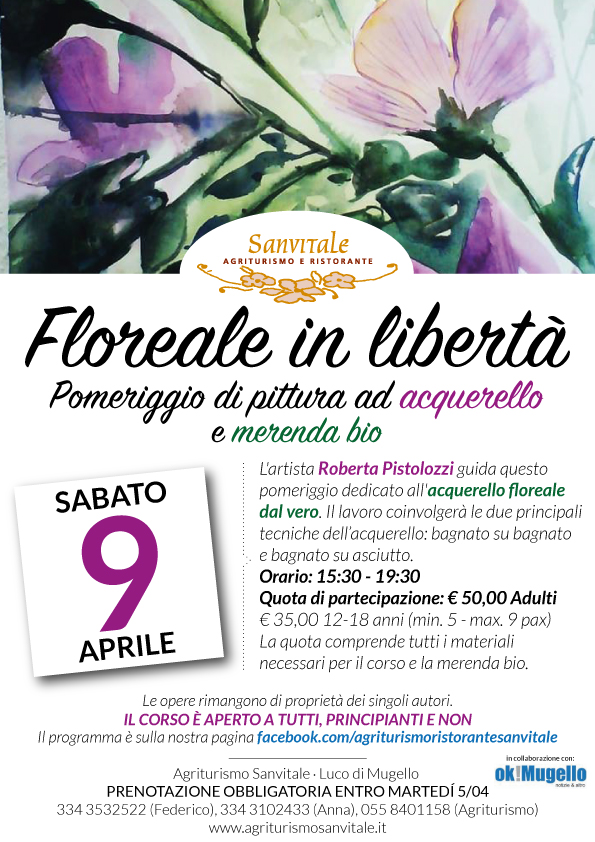 Continuano i pomeriggi dedicati all’Arte all’Agriturismo Sanvitale. Sabato 9 Aprile, alle ore 15,30 è organizzato “”Floreale in libertà”” in collaborazione con l’artista Roberta Pistolozzi.