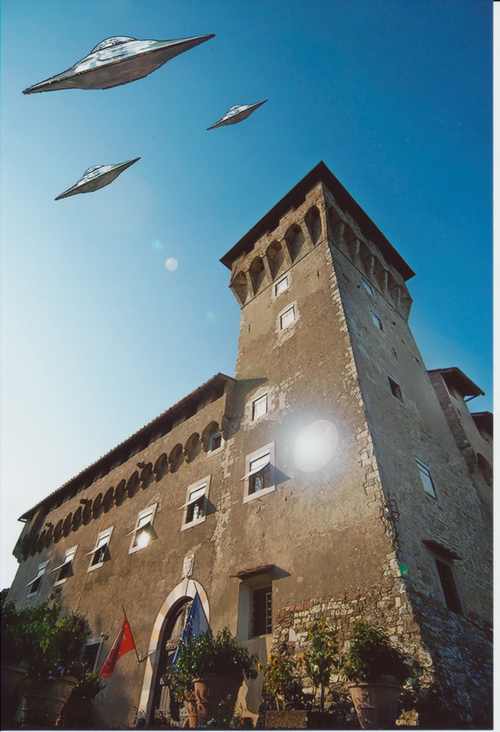 Ogni tanto ci giungono immagini e notizie dal castello mediceo del Trebbio davvero carine e simpatiche, come l’ultima e che molti lettori ricordano poiché ci giunsero diverse segnalazioni, quando per un gioco incredibile di specchi, ideato dal dott.Lorenzo Scaretti, storico proprietario dell’antico maniero all’interno del Castello stesso, con l’ausilio di alcuni personaggi in rigoroso abito rinascimentale, apparvero i fantasmi di Maria Salviati moglie di Giovanni dalle Bande Nere e il loro figlioletto che nel tempo doveva divenire Cosimo I° dè Medici Granduca di Toscana. Una scenografia perfetta. Questa volta ecco giungere sul nostro tavolo una immagine del Trebbio con tre “u.f.o.”, che sorvolano il torrione illuminando con una luce accecante l’antica “meridiana”. Era il giorno della scomparsa negli Stati Uniti dell’astronauta Neil Armostrong e al Trebbio era ospite la nota fotografa Susana Serpas Soriano (nuora dell’economista Paolo Savona), la quale non perse un minuto di tempo scattando questa splendida immagine, per poi inserire gli Ufo in fotomontaggio con la concomitanza ( ideazione di Scaretti) dell’illuminazione accecante della meridiana. Quindi oltre al noto fantasma ecco anche fenomeni inspiegabili di carattere para-astro-anormali in quel del Trebbio. A parte questa ida immaginativa, un cordiale saluto a questa nota fotografa, come Susana Serpas Soriano, conosciuta e stimata in campo nazionale, ospite in uno dei lembi di terrea, con o senza Ufo, fra i più belli del territorio mugellano Nella foto (in alto un particolare) il fotomontaggio con gli ufo al Trebbio
