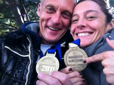 Nelle foto: le medaglie al termine della corsa (in alto) e la coppia alla consegna dei numeri e delle pettorine (qui sotto):