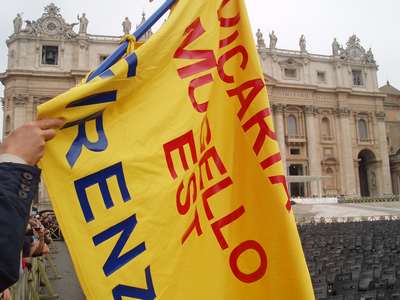 Nelle foto: la foto di gruppo dei partecipanti davanti alla Basilica di San Paolo (in alto) e la bandiera del Mugello Est che sventola davanti a San Pietro per l’Agelus (qui sopra).