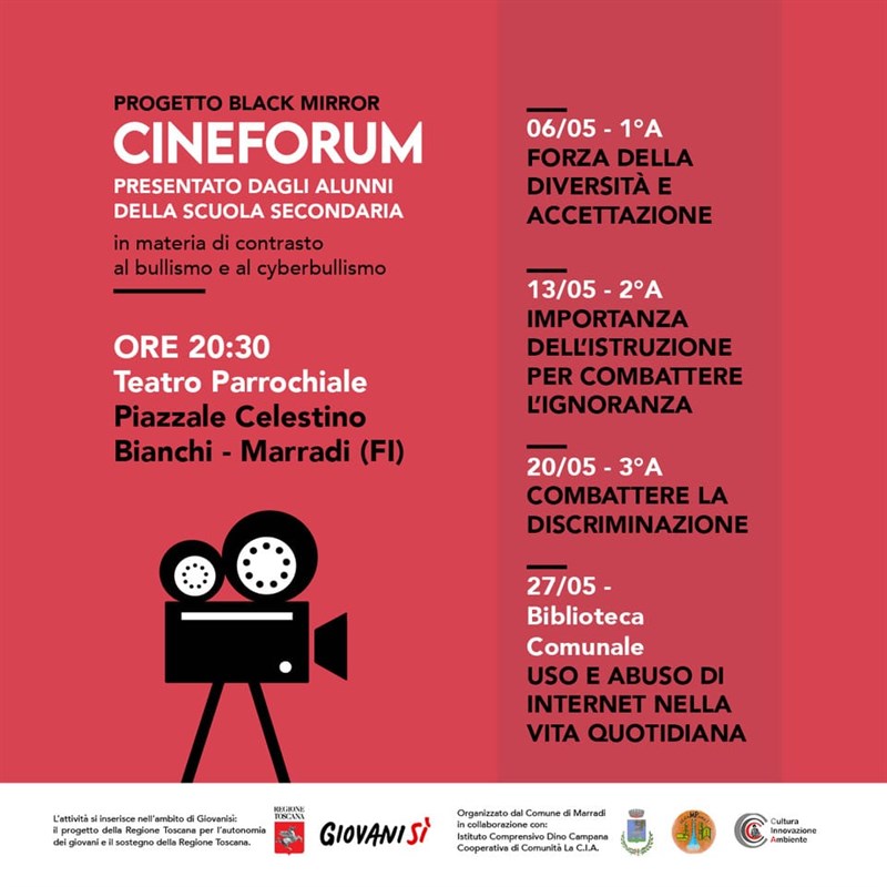 Il Comune di Marradi in collaborazione con l’Istituto Comprensivo Dino Campana e la Cooperativa di Comunità la C.I.A., in seno al progetto “Black Mirror” cofinanziato dalla Regione Toscana nell’ambito di Giovanisì, il progetto della Regione Toscana per l’autonomia dei giovani, presentano il CINEFORUM presentato dagli alunni della Scuola Secondaria di Marradi, con proiezioni di film volti alla sensibilizzazione, prevenzione e contrasto ai fenomeni di bullismo e cyberbullismo. Ogni lunedì di Maggio, alle ore 20.30, presso il Teatro Parrocchiale, ogni classe presenterà un film con una tematica specifica: