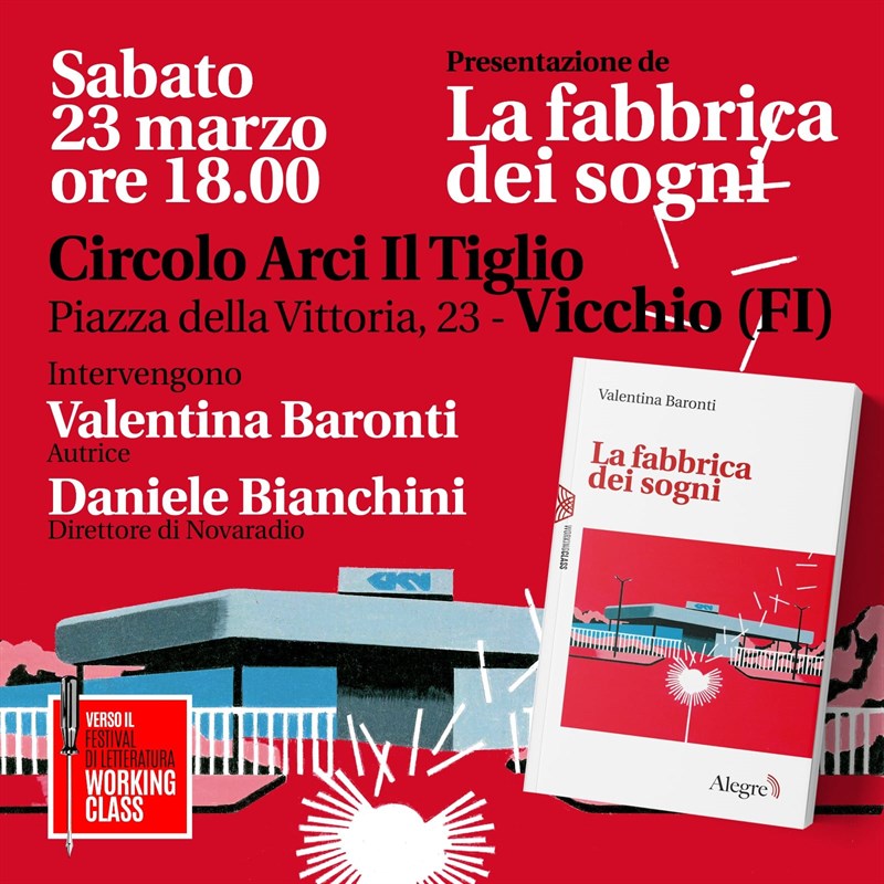 Sabato 23 Marzo tornano le presentazioni letterarie al Circolo Arci Il Tiglio. Ripartiamo con "La fabbrica dei sogni" (ed. Alegre), il romanzo di Valentina Baronti ispirato dalla vicenda della GKN e della lotta dei suoi operai. Una storia che i circoli del territorio, compreso il nostro, hanno seguito da vicino fin da subito, sostenendo l'assemblea permanente del Collettivo Di Fabbrica e contribuendo in modo concreto alla Campagna di crowdfunding per la prima fabbrica socialmente integrata d’Italia che ha raccolto oltre 173mila euro. Con l'autrice, che sarà ospite del Circolo, dialogherà Daniele Bianchini. L'appuntamento è alle 18.00 e a seguire ci sarà anche un apericena al Circolo.