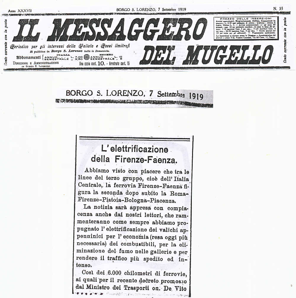In questi ultimi tempi abbiamo letto con grande evidenza, altrettanta sorpresa e non di meno molta meraviglia sui vari quotidiani cartacei e giornali On Line, la notizia dei trenta milioni ritrovati per ammodernare la linea ferroviaria “Faentina”, in modo particolare la sua elettrificazione, ma con una discrepanza nel senso che il protocollo d’intesa del 1997 (venti anni orsono) parla di linea “Faentina” la tratta Firenze, Borgo San Lorenzo, Pontassieve, ma non il percorso Borgo San Lorenzo Faenza, che è, e resta il più importante. Non sappiamo se realmente ci sono questi soldi, non sappiamo se questi lavori inizieranno, ci pare insomma che molto ancora sia aleatorio, anche leggendo a destra e manca lunghissimi ed ampollosi servizi giornalistici su questo importante argomento. Si dice il caso mentre eravamo a fare una ricerca sul Messaggero del Mugello, (3 settembre dell’anno 1919), tre mesi dopo il terribile terremoto del 29 giugno che devastò il Mugello, già devastato dalla Prima Guerra mondiale, con centinaia e centinaia di morti, dispersi, feriti e prigionieri, con una miseria e una fame da far paura, ecco che appare sul settimanale mugellano questo articolo. Era abbastanza lungo ed ampolloso, come quegli ai giorni nostri, ci è bastato pubblicare una piccola parte con tanto di titolo; niente di più. Domenica a pranzo avremo modo e tempo di parlare di questa eclatante notizia di 96 anni orsono, rilanciata nel 2016! Buon appetito. Foto 1. Anno 1919. L’articolo del “Messaggero del Mugello” sulla notizia dell’elettrificazione della Linea Ferroviaria Faentina. (Archivio A. Giovannini)