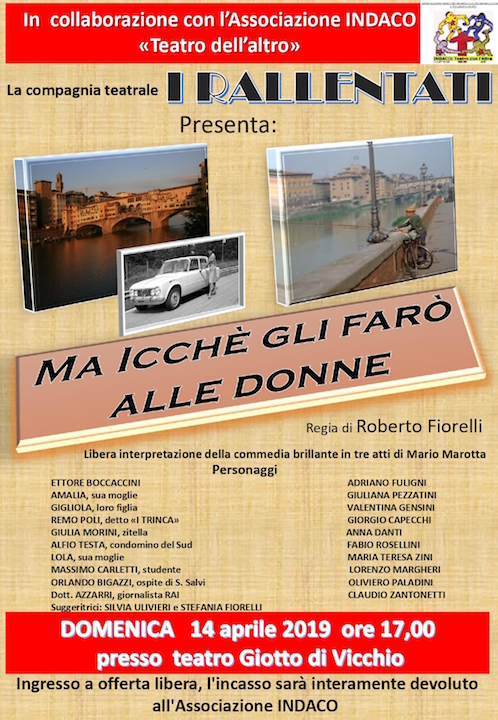 La compagnia teatrale I Rallentati, in collaborazione con l’associazione Indaco “”Teatro dell’altro””, presenta il suo nuovo spettacolo: “”Ma icchè gli farò alle donne””. La commedia andrà in scena domenica 14 aprile 2019 alle 17:00, presso il teatro Giotto di Vicchio. L’ingresso sarà ad offerta libera e verrà interamente devoluto all’associazione Indaco. Il regista di quella che ha tutti i presupposti per essere definita una commedia brillante è Roberto Fiorelli: per la trama, ci si basa su una libera interpretazione dell’opera in tre atti di Mario Marotta. Calcheranno le scene Adriano Fuligni, Giuliana Pezzatini, Valentina Gensini, Giorgio Capecchi, Anna Danti, Fabio Rosellini, Maria Teresa Zini, Lorenzo Margheri, Oliviero Paladini e Claudio Zantonetti.