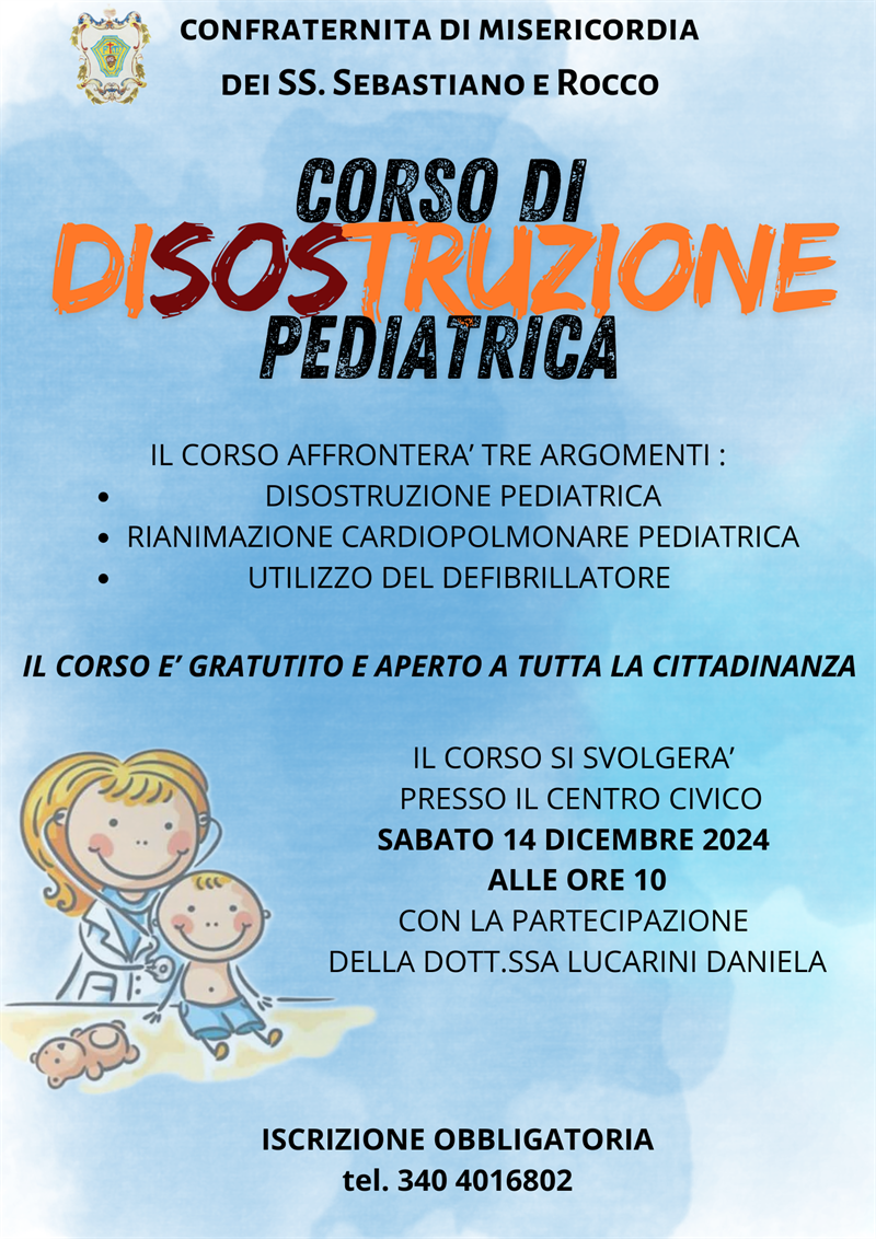 La Misericordia di Barberino di Mugello promuove un’importante iniziativa rivolta a tutta la cittadinanza: un Corso di Disostruzione Pediatrica, che si terrà sabato 14 dicembre 2024 presso il centro civico di Barberino, in via Vespucci, a partire dalle ore 10.