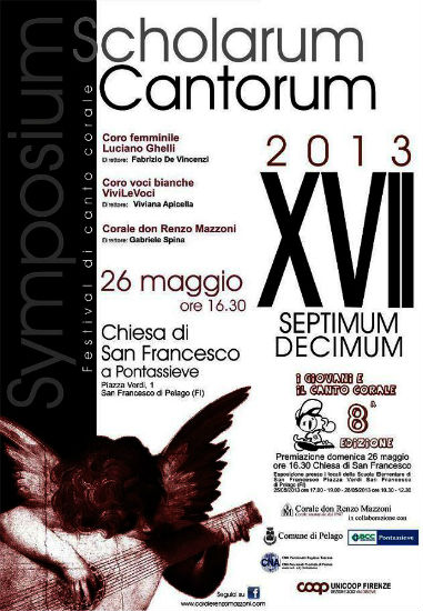 Portiamo gentilmente a conoscenza, grazie ai dirigenti delle Associazioni Associazioni, che sabato 25 maggio 2013, alle ore 17,00, alla presenza delle Autorità del Comune di Pelago presso i locali della Scuola Primaria di San Francesco di Pelago, Piazza Verdi,1 ci sarà l’apertura della mostra degli elaborati realizzati dagli alunni della Scuola Primaria di Pelago (quattro classi) e di San Francesco (10 classi) che hanno aderito alla VIII edizione del progetto denominato “I Giovani e il Canto Corale”. Gli elaborati sono stati realizzati dopo l’ascolto di tre brani (Fratello Sole, Sorella Luna di R. Ortolani, Halleluja da Messiah di G.F. Händel e O Signore dal tetto natìo da I Lombardi alla I Crociata di G. Verdi). Domenica 26 maggio 2013, alle ore 16,30 nella Chiesa di San Francesco a Pontassieve, piazza Verdi n 1, in San Francesco, frazione di Pelago (FI) si terrà il Septimum Decimum Symposium Scholarum Cantorum, festival di canto corale. Si esibiranno: il Coro femminile “Luciano Ghelli” di Pratovecchio (AR) diretto dal m° Fabrizio De Vincenzi, il Coro di Voci Bianche “ViviLeVoci” di Firenze diretto dal m° Viviana Apicella e la Corale don Renzo Mazzoni di San Francesco di Pelago (FI) diretta dal m° Gabriele Spina.