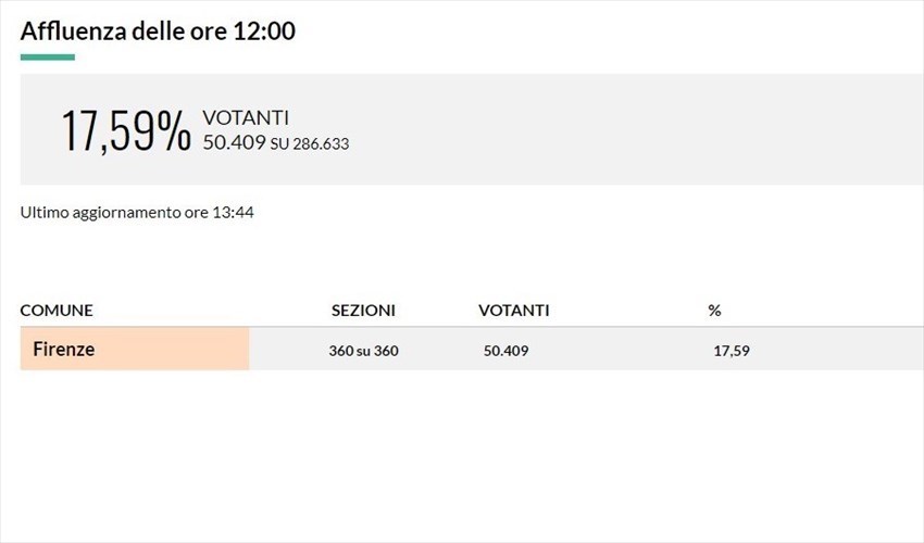 A Firenze invece nella circoscrizione Firenze 1 affluenza alle 12 del 17,59%, nella Firenze 4 (Calenzano, Campi, Lastra a Signa, Scandicci, Sesto e Signa) del 16,34%
