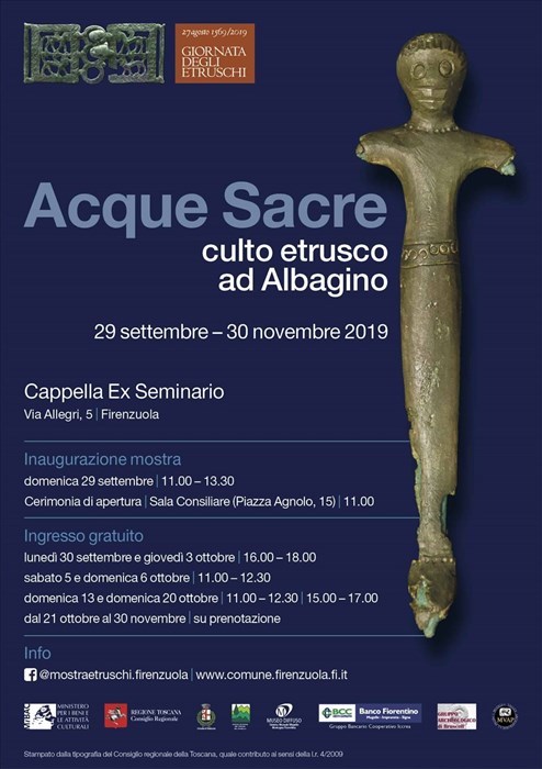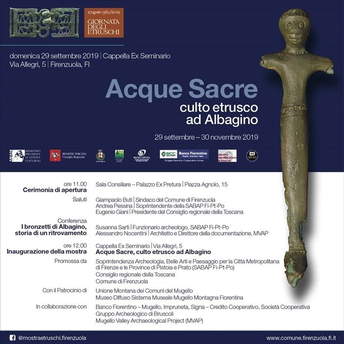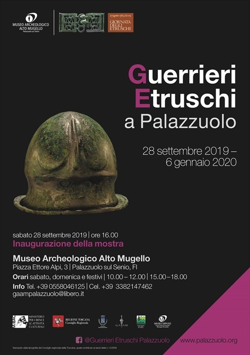 A Palazzuolo vengono esposte due tombe di guerrieri, di cui sono stati ricostruiti i corredi ed effettuati i restauri grazie all’impegno del Gruppo Archeologico dell’Alto Mugello e il contributo di aziende e cittadini di Palazzuolo. L’altra esposizione presenta un gruppo di 16 bronzetti etruschi, databili tra VI e IV secolo a.C. Già esposti nel 2017-2018 per le Giornate degli Etruschi al Palazzo del Pegaso a Firenze, insieme a ritrovamenti etruschi del Lago degli Idoli del Falterona, per la prima volta vengono portati a Firenzuola, nel cui territorio in località Albagino sono stati ritrovati nel 2016 dal Gruppo Archeologico di Bruscoli e consegnati alla Soprintendenza di Firenze.