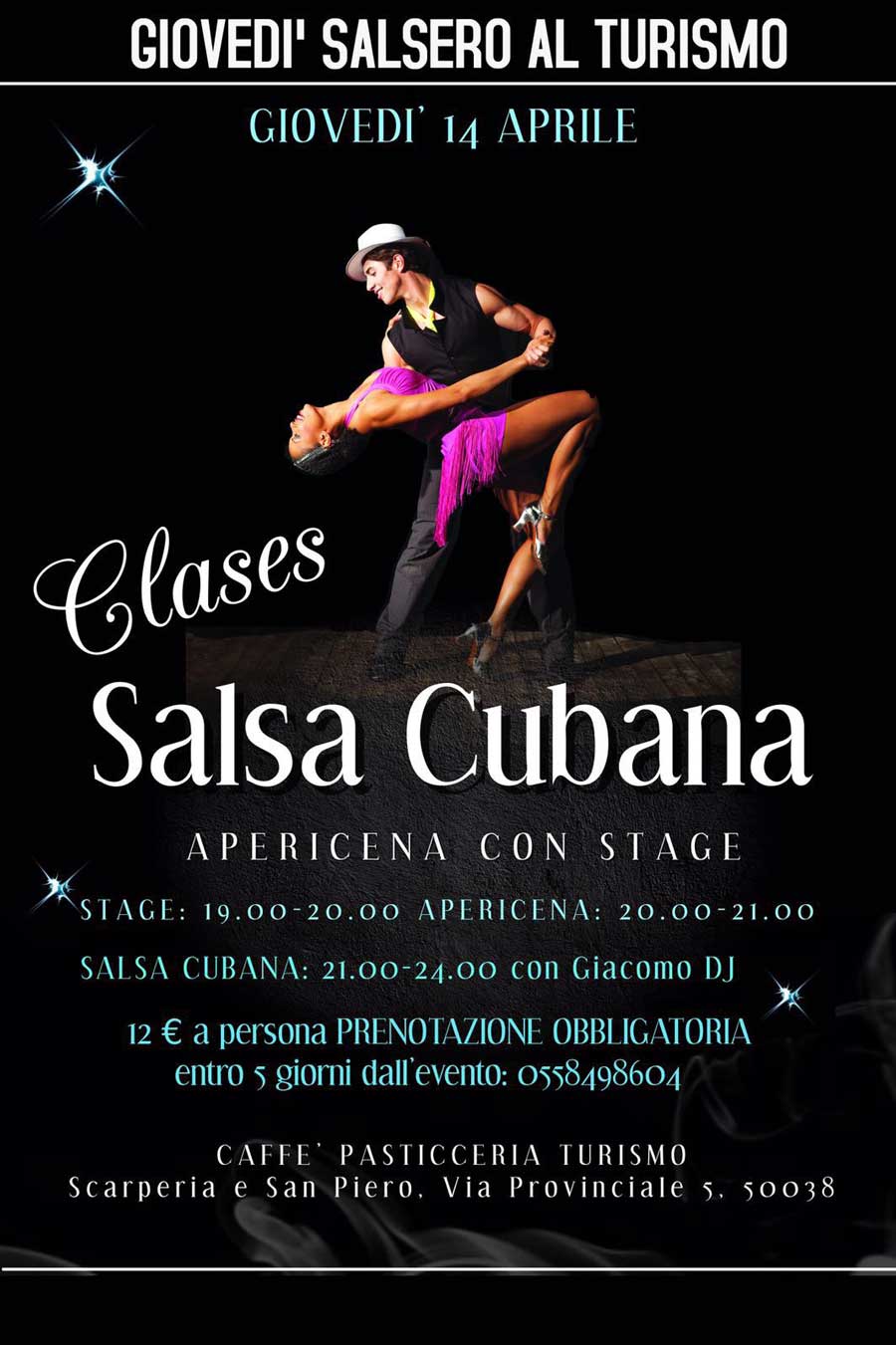 Giovedì 14 Aprile una serata a ritmo di Salsa Cubana. Il Caffè Pasticceria Turismo organizza un piacevole apericena con “”stage”” di ballo per imparare a muovere i primi passi di Salsa Cubana con Giacomo DJ. Un giovedì frizzante che vede lo stage di Salsa in programma dalle ore 19,00 fino alle 2o,00; a seguire l’apericena per proseguire sui ritmi calienti per una serata di divertimento. E’ richiesta la prenotazione obbligatoria al numero 0558498604 oppure compilare il modulo sottostante.