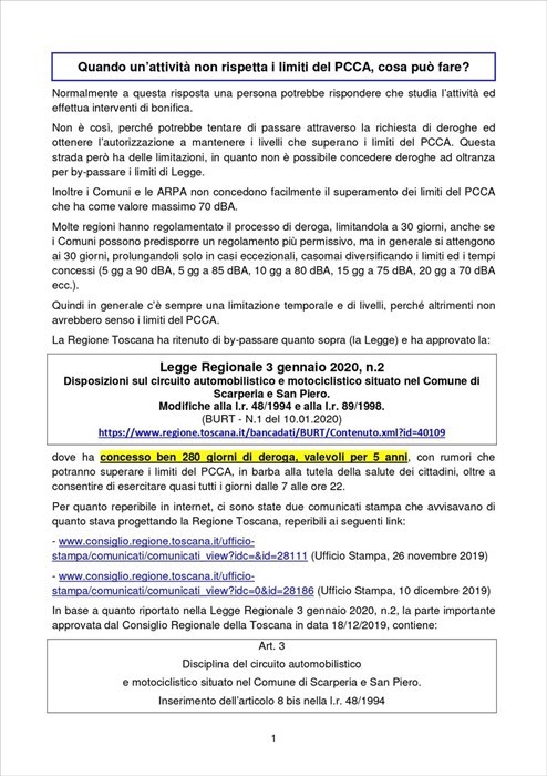 Scrivono dal comitato Il Suono del Mugello: In questo momento critico per il mondo e per l’Italia a causa di questo nuovo virus che pone drammaticamente l’accento sulla peculiarità della salvaguardia della salute di ogni cittadino, vorremmo condividere questo documento redatto da un ingegnere e diffuso nel settore da Assoacustici che mostra come la nuova Legge Regionale studiata e approvata a fine anno da Consiglio Regionale della Toscana NON rispetti assolutamente nessun parametro a protezione della salute di coloro che giornalmente sono e saranno esposti alle emissioni inquinanti del Circuito del Mugello.