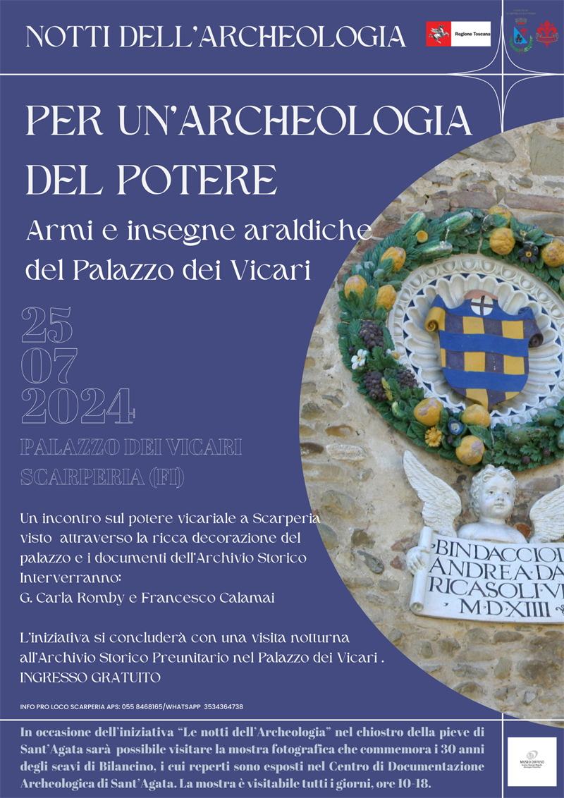 - Giovedì 25 luglio; Le Notti dell’archeologia: “Per un’archeologia del potere: armi e insegne araldiche del Palazzo dei Vicari”. Un incontro sul potere vicariale a Scarperia visto attraverso la ricca decorazione del palazzo e i documenti d’archivio. Con interventi di G. Carla Romby e Francesco Calamai e successiva visita all’Archivio Storico Preunitario. Ore 21, Palazzo dei Vicari, ingresso gratuito.