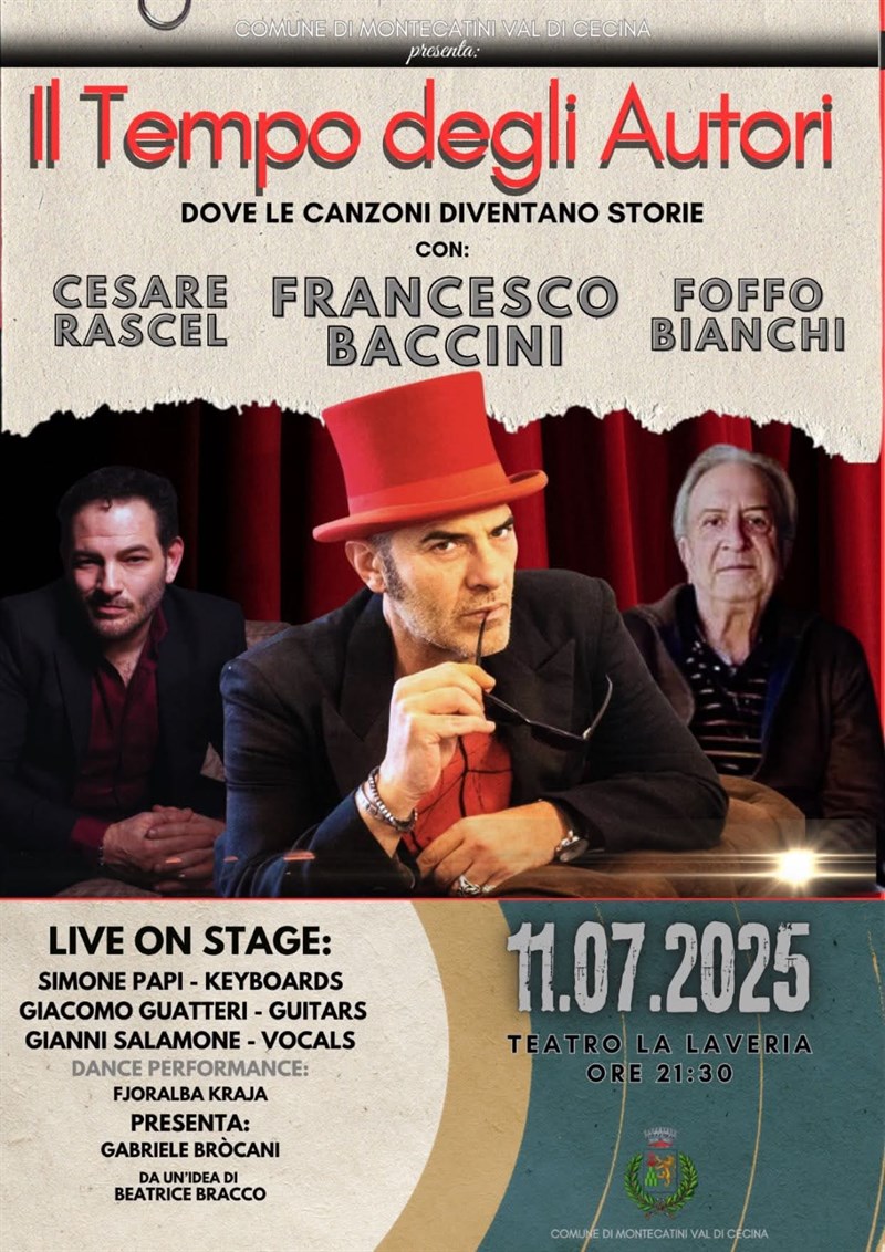 Nel suggestivo scenario del Teatro La Laveria, all’interno della storica Miniera di Rame di Montecatini Val di Cecina, si è svolto lo spettacolo “Il tempo degli Autori – Dove le canzoni diventano storie”, un format che ha saputo coniugare con grande sensibilità musica, narrazione, memoria collettiva e valorizzazione del territorio. Un evento ideato e curato dalla mugellana Beatrice Bracco, professionista poliedrica attiva da anni nel mondo dello spettacolo – tra casting cinematografici, produzione artistica e progettazione culturale – che ha saputo dare vita a un progetto originale capace di unire arte e comunità, in una serata emozionante e partecipata.