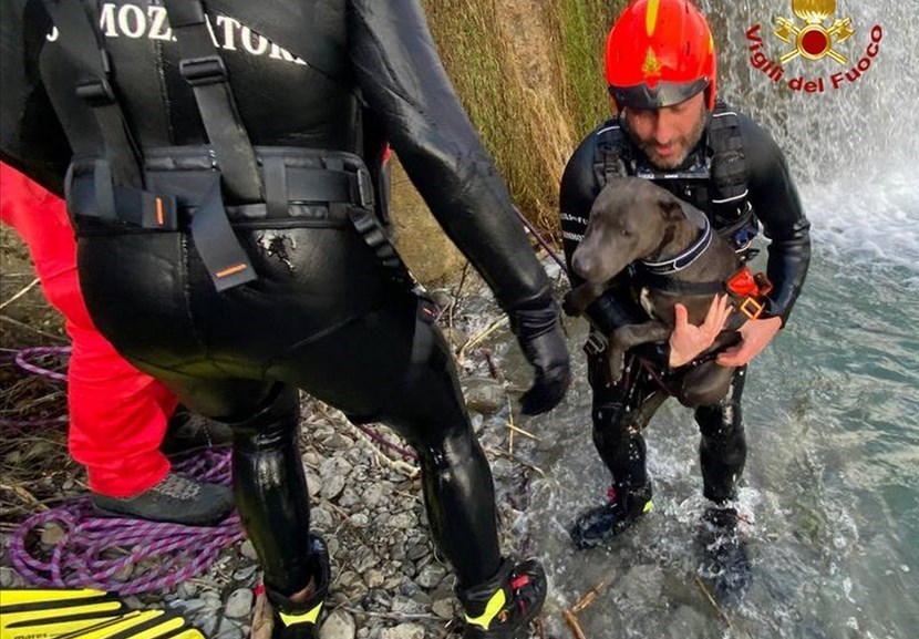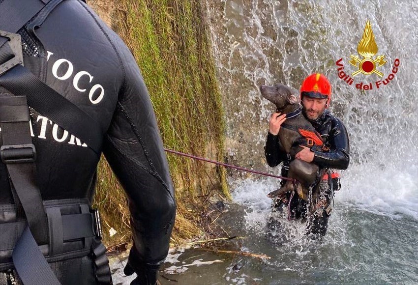 Ieri le condizioni del fiume hanno permesso di poter perlustrare la zona che si trova sotto la cascata e i sommozzatori dei vigili del fuoco hanno ritrovato il cane vivo e incolume. L'animale è stato poi affidato ai suoi proprietari.