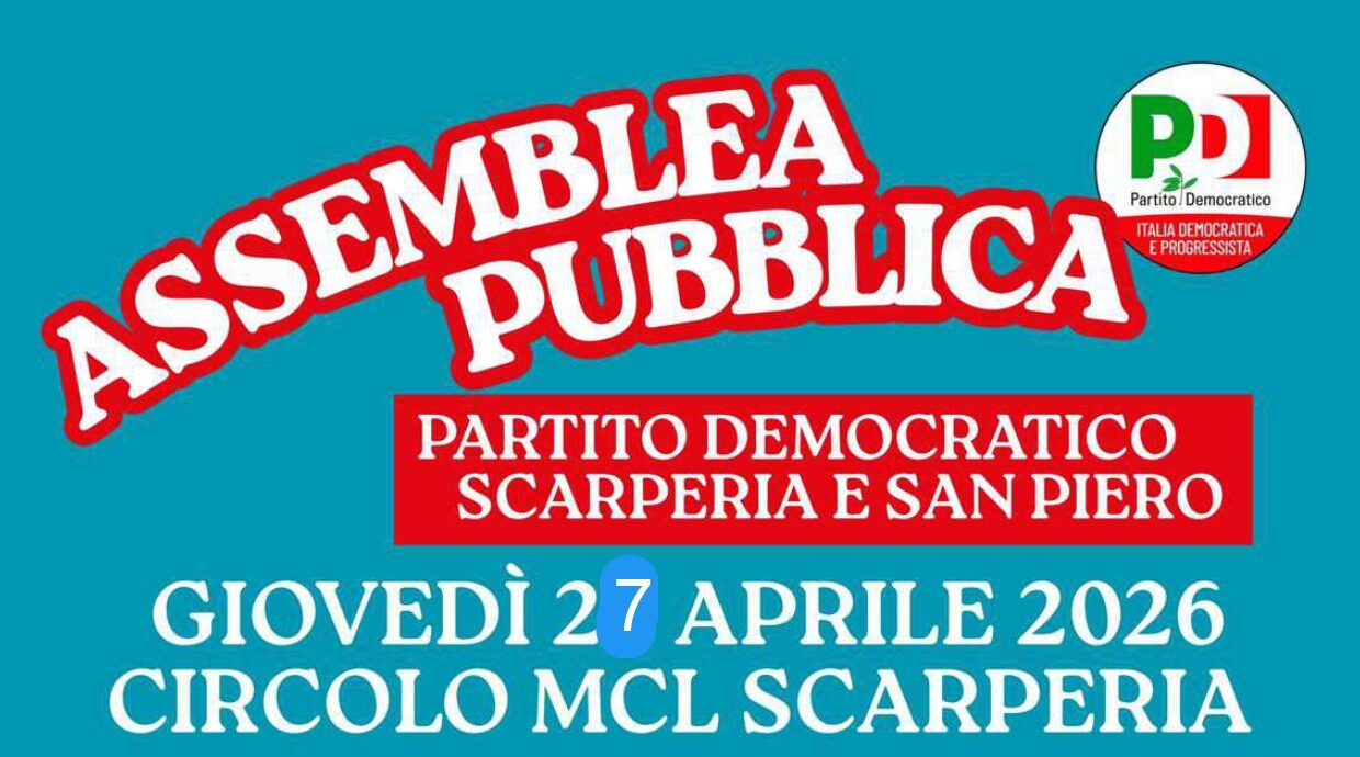 Il Circolo del Partito Democratico di Scarperia e San Piero comunica il rinvio dell’assemblea pubblica inizialmente prevista per il 23 aprile, a causa di impegni parlamentari non derogabili del deputato Federico Gianassi. L’incontro è stato riprogrammato per lunedì 27 aprile 2026, mantenendo invariati orari, luogo…